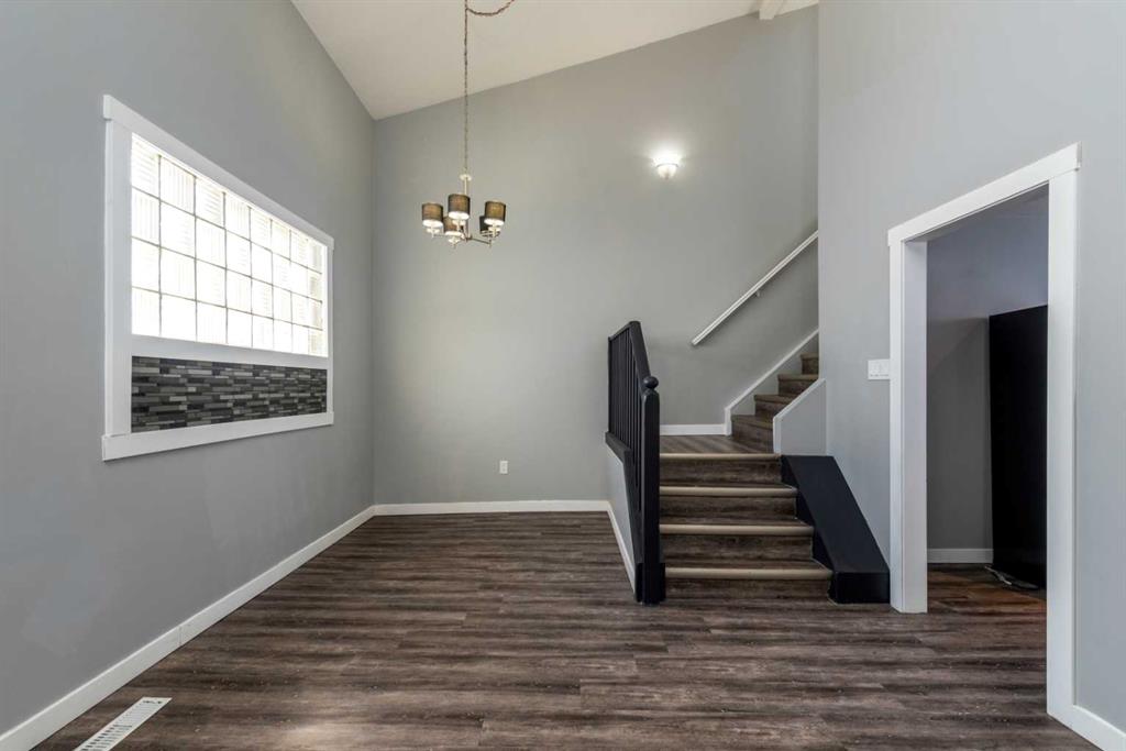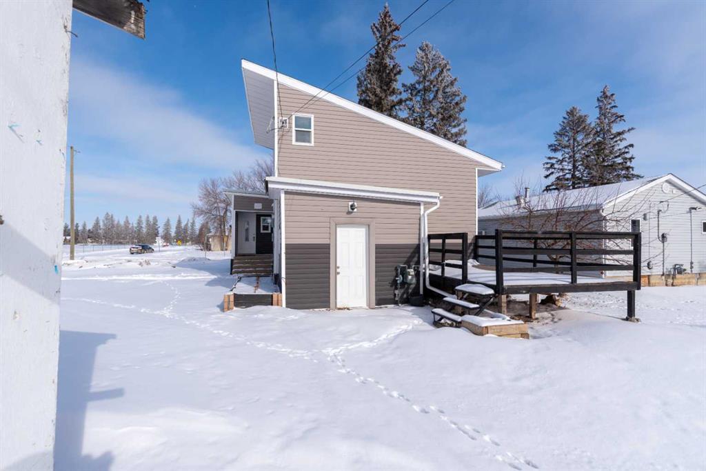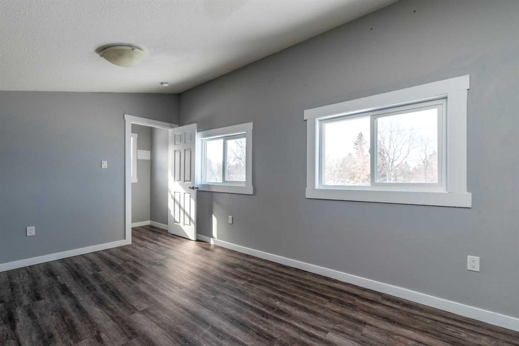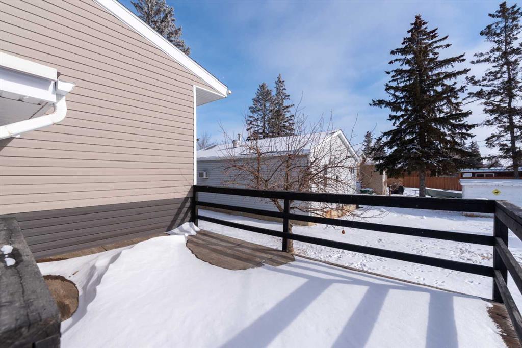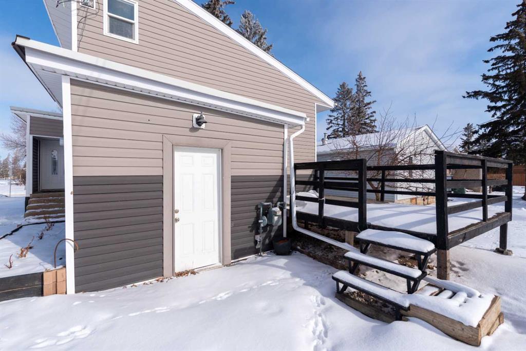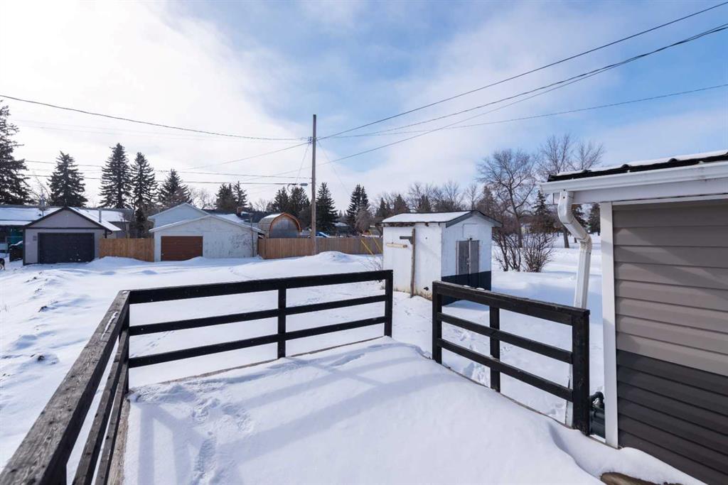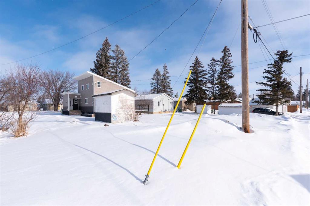 Make your move! This charming character home has been professionally renovated inside and out since 2019. Including internal weeping tile and sump, vinyl siding, roof and shingles, windows, exterior doors, hot water tank, waterproof laminate flooring, interior doors and trim, kitchen and bathroom renovations, electrical throughout the home with a new panel and light fixtures. This is a unique property located on a double, corner lot (69x122 feet) with a rear alley and included storage shed – there is a TON of potential and space here for your future garage or quiet and private, dream yard with direct neighbours limited to one! Across the street to the west is lovey Miner Park and the location is quiet but central enough to be in close proximity to all services and amenities. Inside you are welcomed to a supersized foyer or boot room with endless potential to be set up for your storage needs. Upon entering the open concept, living and dining space of the home you find dramatic 14 foot vaulted ceilings adding a sense of grandeur with bright natural light from a glass block feature window. The renovated kitchen is tucked away and private from the dining area with included appliances and a view overlooking the yard and park. A spacious four piece bath with room for extra storage completes this level. The second level staircase combines functionality with an aesthetic focal point and upstairs there is the primary bedroom with plenty of storage and also that west view of the park from the second level. On your way downstairs to the basement you find the back door access with a rear foyer (electrified on a sensor but not heated). This entry way could be easily separated for extended family or a roommate to have a bit of extra privacy. The basement is currently a family room, bedroom and laundry/utility area but there are egress windows in the basement and there would be room for a third bedroom if a buyer requires this. There are also new ceiling tiles in the basement, there is a sump pump and the furnace is older but was rebuilt in the late 90s and has had no issues. Immediate possession is available, schedule a viewing today and see how well this property could work as your new home!